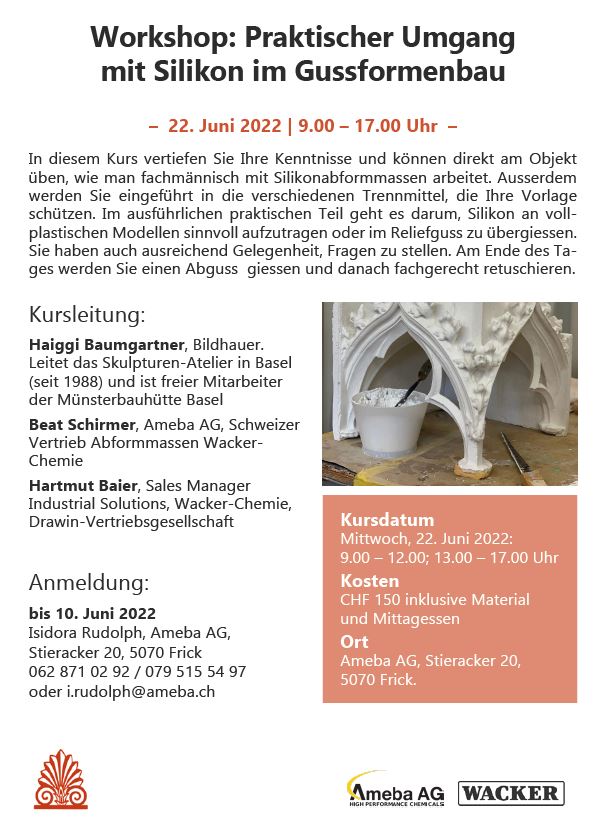 In regelmässigen Abständen veranstalten wir in unseren Räumen Workshops mit ausgewiesenen Profis zu hochspezialisierten Themen, u.a. für Steinmetze und Bildhauer zu Formenbau. In Zukunft folgen auch Workshops zu Elektrovergussmassen und Klebeanwendungen mit Strukturklebstoffen.